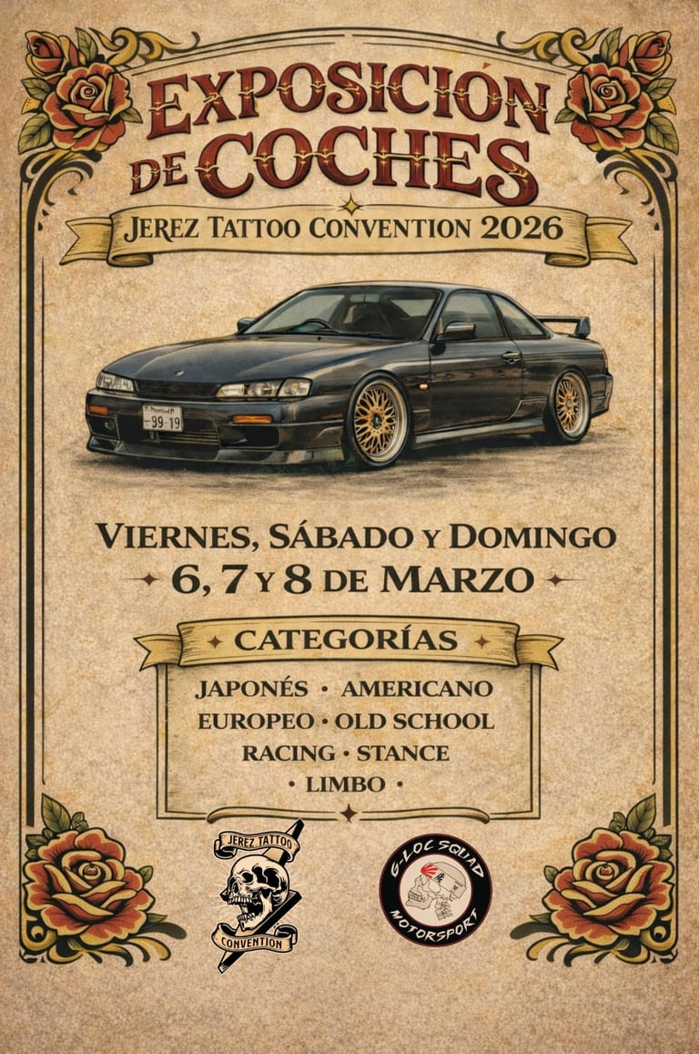 Otro año más, desde G-LOC SQUAD tendremos el placer de organizar la Exposición de Coches dentro de la Jerez Tattoo Convention, un espacio donde el motor, la personalización y la cultura custom se unen en un mismo lugar.